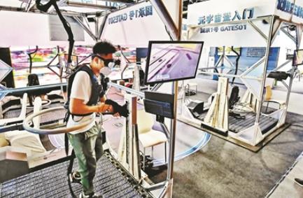 北青報記者來到全球數(shù)字經(jīng)濟大會“開元之境”元宇宙體驗館。首先看到了由專注VR技術(shù)研發(fā)的創(chuàng)新公司STEPVR帶來的全球首款元宇宙登入門“國承1號”。在3平方米左右的空間內(nèi),體驗者站在一個可以360度自由移動的全向運動系統(tǒng)中,戴上超輕薄VR頭顯、穿上帶觸感的震動馬甲,通過這臺機器,可以走進元宇宙的綠洲世界,體驗各類熱門游戲,甚至包括CS、MOBA類需要移動的對戰(zhàn)游戲。在騰訊展臺前,參觀者進入“云游長城”微信小程序,不僅可以遠眺巍峨壯闊的萬里長城,近距離欣賞長城的一磚一瓦、一草一木,還可以身臨其境地在數(shù)字長城里自由“走動”,體驗在線“爬長城”,甚至還可以在云端體驗修繕長城時需要經(jīng)歷的考古、清理、砌筑、勾縫、磚墻剔補和支護加固等流程。